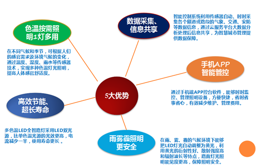 In the energy shortage, the greenhouse effect becomes more and more serious, the state and local government strongly calls for energy-saving emission reduction, green lighting, our anti fog and haze LED intelligent street lamp system through the full independent intellectual property rights of independent research and development Internet plus color temperature, effective control of energy consumption, improve the lamp life, reduce the cost of maintenance and management, in accordance with the traffic automatically adjust the brightness, lighting control, remote alarm, active fault lamp cable anti-theft function, can greatly save power resources, improve public lighting management, save maintenance cost.
