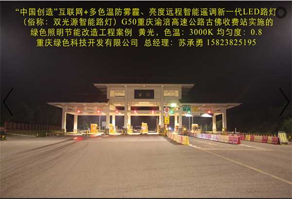 Division I (national high-tech enterprises) in Chongqing G50 Chongqing Fuling expressway toll station, the implementation of the "China Gufo creation" Internet plus color temperature, brightness and anti fog haze remote intelligent remote adjustment of a new generation of LED Street (commonly known as: Chameleon intelligent street lamp) green lighting project. In the highway lighting in the use of the Chinese creation "Internet plus color temperature, brightness and anti fog haze remote intelligent remote control of a new generation of LED street lamp and the intelligent control system, better stability, higher reliability, color, light response speed is more agile. It has four major characteristics: the technology has four major characteristics: (a) by PM2.5 sensor, temperature sensor, ultrasonic sensor, radar remote camera automatic acquisition of environmental protection, meteorology, transportation, security and other information, analyze the information sharing and data services through the cloud platform. (two) in different climate and season, according to the change of climate and environmental sensory needs people, through the temperature sensor, humidity sensor, PM2.5 sensor, intelligent remote control to achieve a variety of lighting lamps, color temperature, improve the human sensory comfort. The remote intelligent control system automatically collects the temperature, rain, fog and haze data of the lighting environment, and intelligently regulates the light color temperature to be the most comfortable and safest lighting value (3000K-5700K). (three) the brightness of light can be remotely intelligently adjusted. In different time periods, different light intensity, different traffic flow, etc., through the photosensitive sensors, ultrasonic sensors, radar sensors and other intelligent control, to achieve a variety of brightness lighting mode. In different periods of light adjustment for a variety of lighting mode, including "daytime mode", "night mode", "summer mode" and "winter mode" and "anti haze mode", which greatly improve the saving rate, and effectively solve the tunnel lighting for saving electricity is widely adopted for closed control loop or interval lights cause lighting the dark zone, the presence of traffic safety problems. (four) the important parameters such as luminance uniformity, illuminance uniformity and energy saving rate are all better than the national standard of LED street lamps. A new generation of multi-color temperature LED intelligent street lamp, one can be used when more than one ordinary monochromatic temperature LED street lamp, the cost performance is higher, can improve the light efficiency of 10%, and prolong the service life of lamps more than doubled. Intelligent color matching and dimming lighting are more comfortable, safe and energy-saving. This product is our use of a number of independent patent technology (patent number: 201320842388, 201320028126, 2015204938054) R & D, manufacturing "China creation" Internet plus color temperature anti haze brightness remote adjustment of a new generation of LED intelligent lighting products, the science and technology novelty has won the "novelty search report" (No: J201508016831). That is the "China creation", the one and only LED lamps advanced technology application of intelligent manufacturing technology; it has been included in the "2015 annual scientific and technological achievements into the project" Chongqing City SME (small enterprises in Yuzhong 2015 No. 188), approved the establishment of Chongqing City Engineering Research Center [LED Intelligent Control Technology Chongqing 2015 technology development and reform No. 1865]; has been included in the "2016 Chongqing Internet plus pilot demonstration project", "2016 year Chongqing city technology innovation guidance project". Has obtained "Chongqing hi tech products", "Chongqing municipal industry new technology certification" certificate.