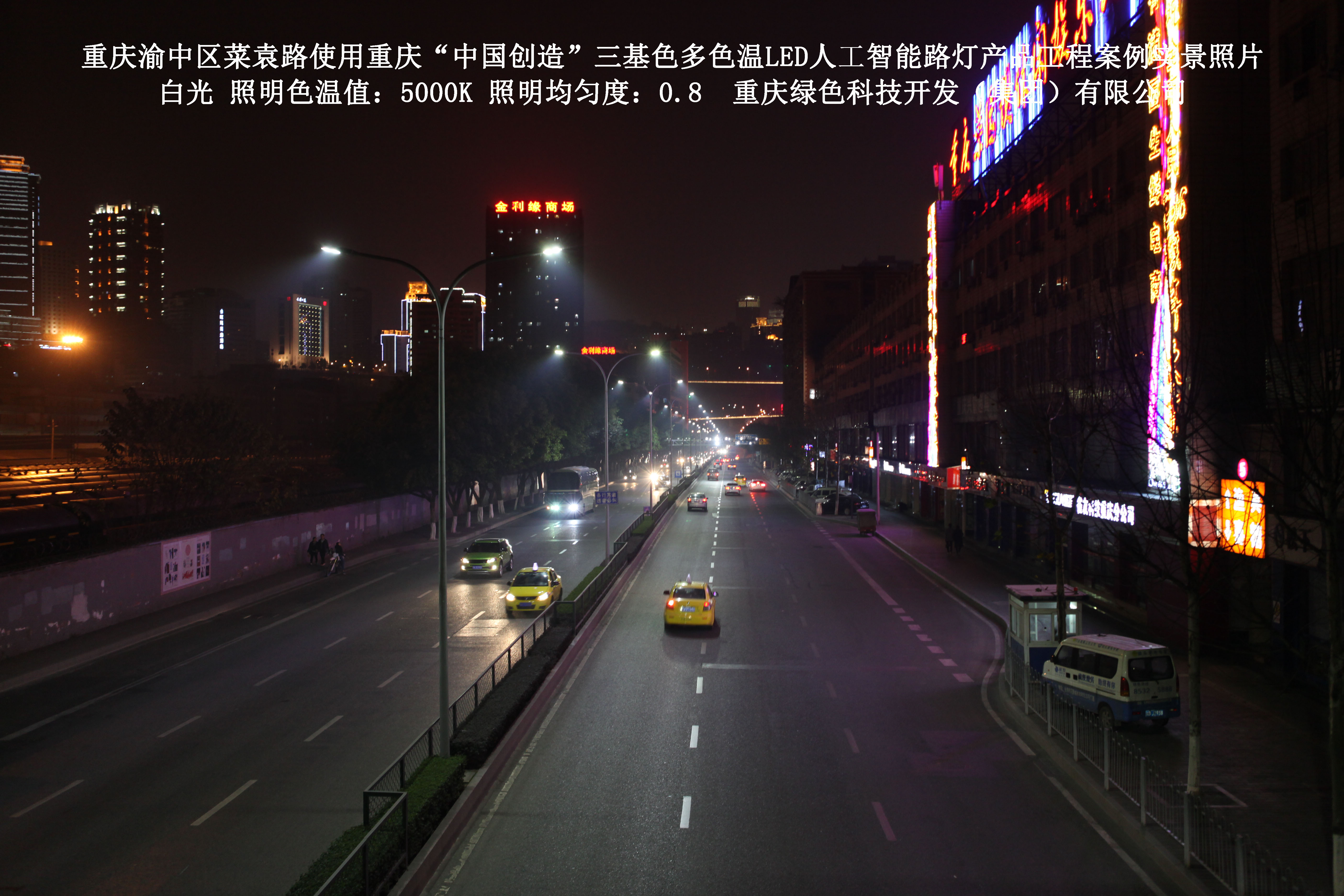 2013年10月,重慶市城市照明管理局使用了我司研發(fā)制造的重慶“中國(guó)創(chuàng)造”三基色多色溫LED人工智能路燈,對(duì)渝中區(qū)菜袁路實(shí)施了綠色照明科技節(jié)能改造工程,該工程已全面竣工。工程實(shí)施后,極大地提高了城市照明清晰度、燈光均勻度、舒適度。通過(guò)智能終端實(shí)現(xiàn)單燈感知、線纜防盜報(bào)警,與原高壓鈉燈相比,節(jié)能率60%以上,有效解決了關(guān)閉控制回路或間隔關(guān)燈方式造成的照明暗區(qū),確保行人和車輛通行的安全,實(shí)現(xiàn)城市路燈照明系統(tǒng)的智能化管理,推進(jìn)了智慧城市建設(shè)。