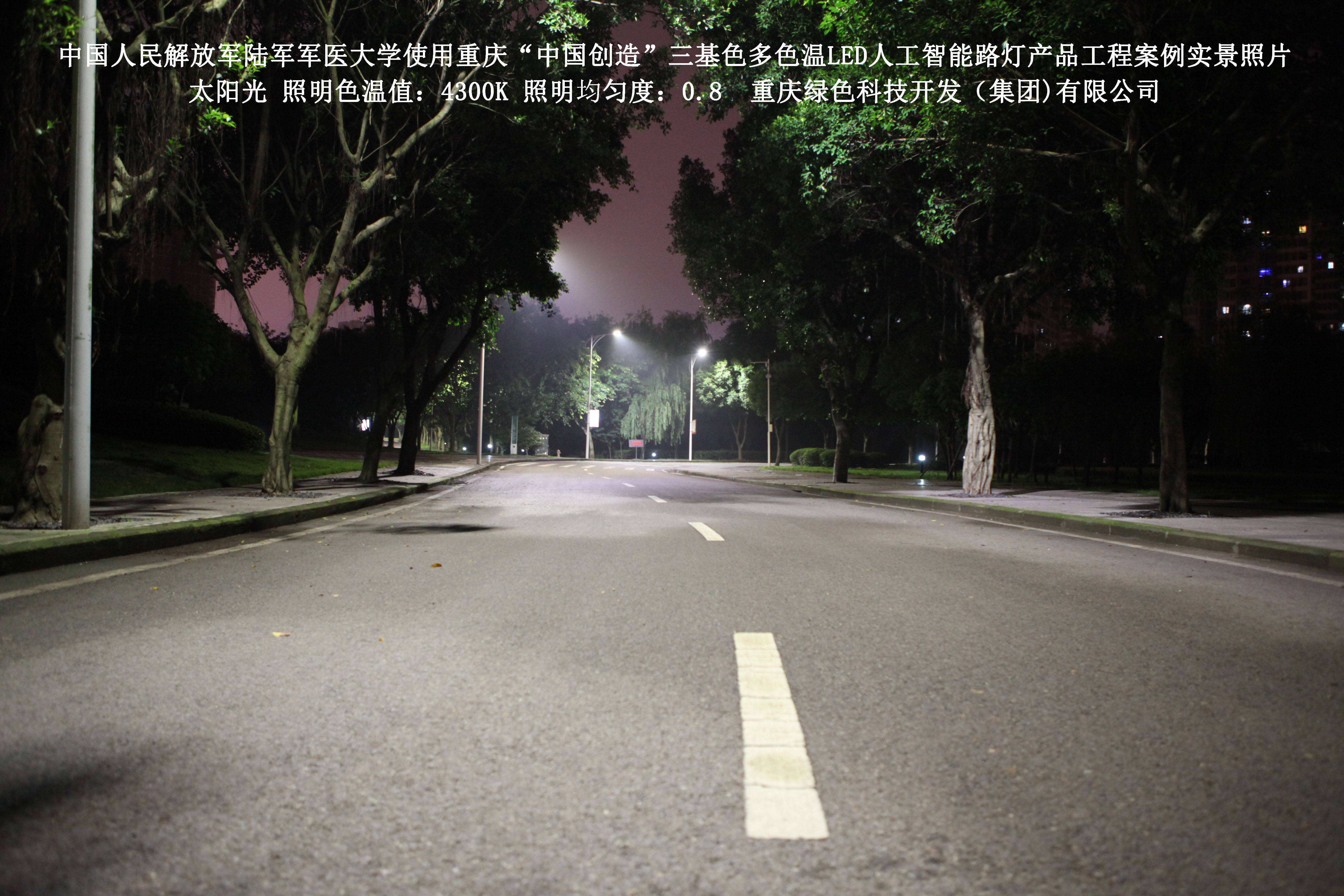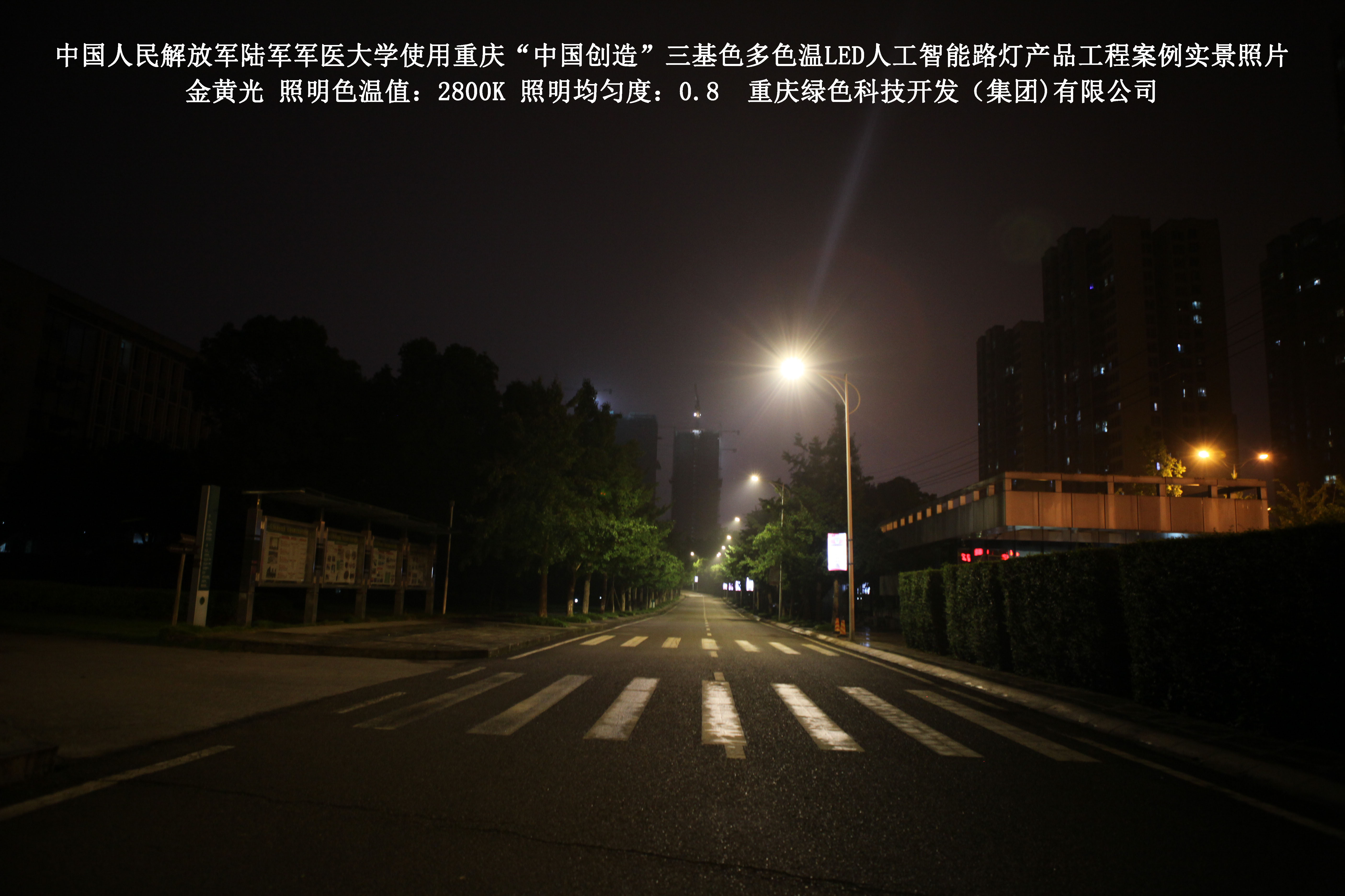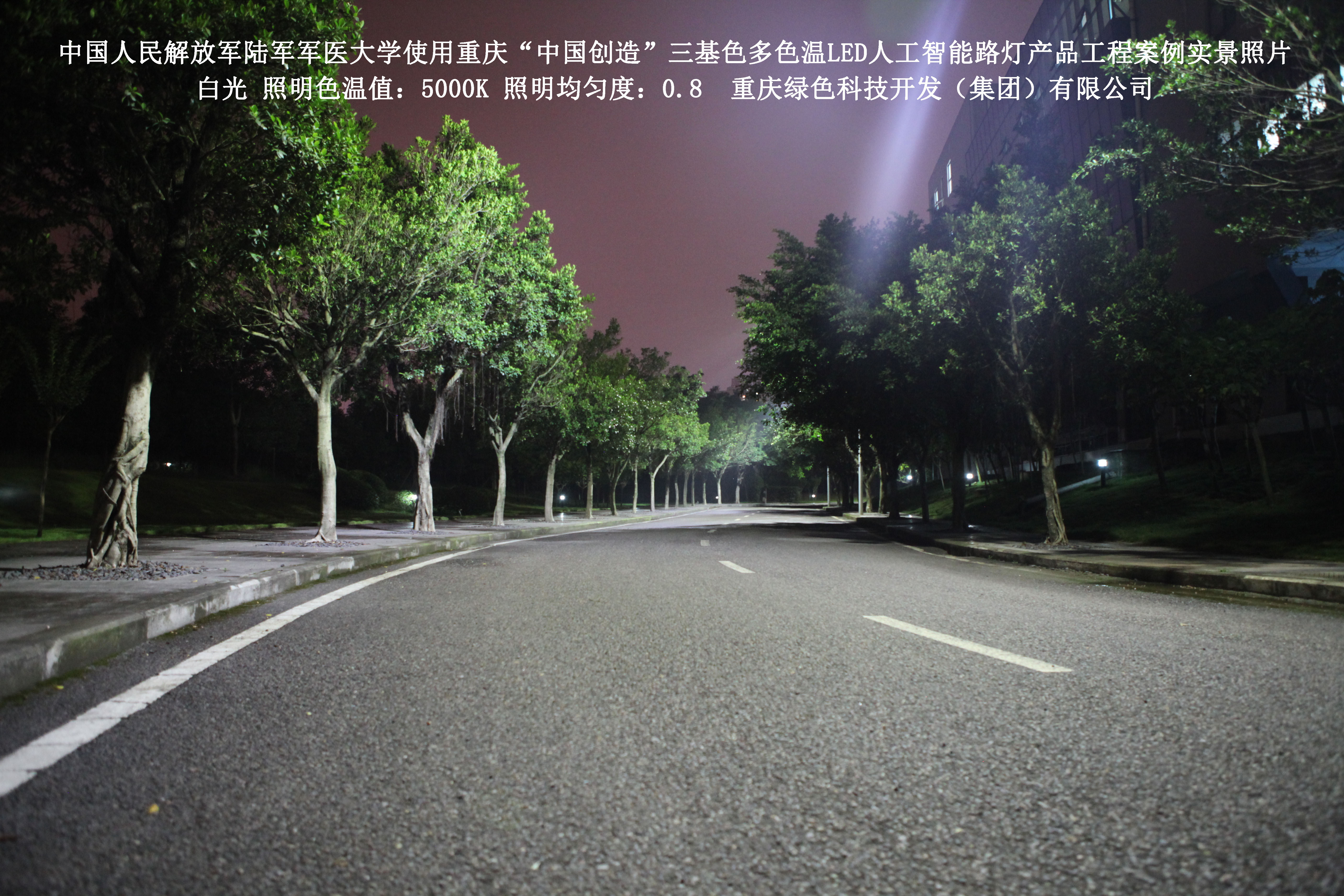 2018年4月,中國(guó)人民解放軍陸軍軍醫(yī)大學(xué)使用了我司研發(fā)制造的重慶“中國(guó)創(chuàng)造”三基色多色溫LED人工智能路燈,對(duì)沙坪壩大學(xué)城校區(qū)道路實(shí)施了綠色照明科技節(jié)能改造工程,該工程已全面竣工。工程實(shí)施后,極大地提高了照明清晰度、燈光均勻度、舒適度,實(shí)現(xiàn)城市路燈照明系統(tǒng)的智能化管理。