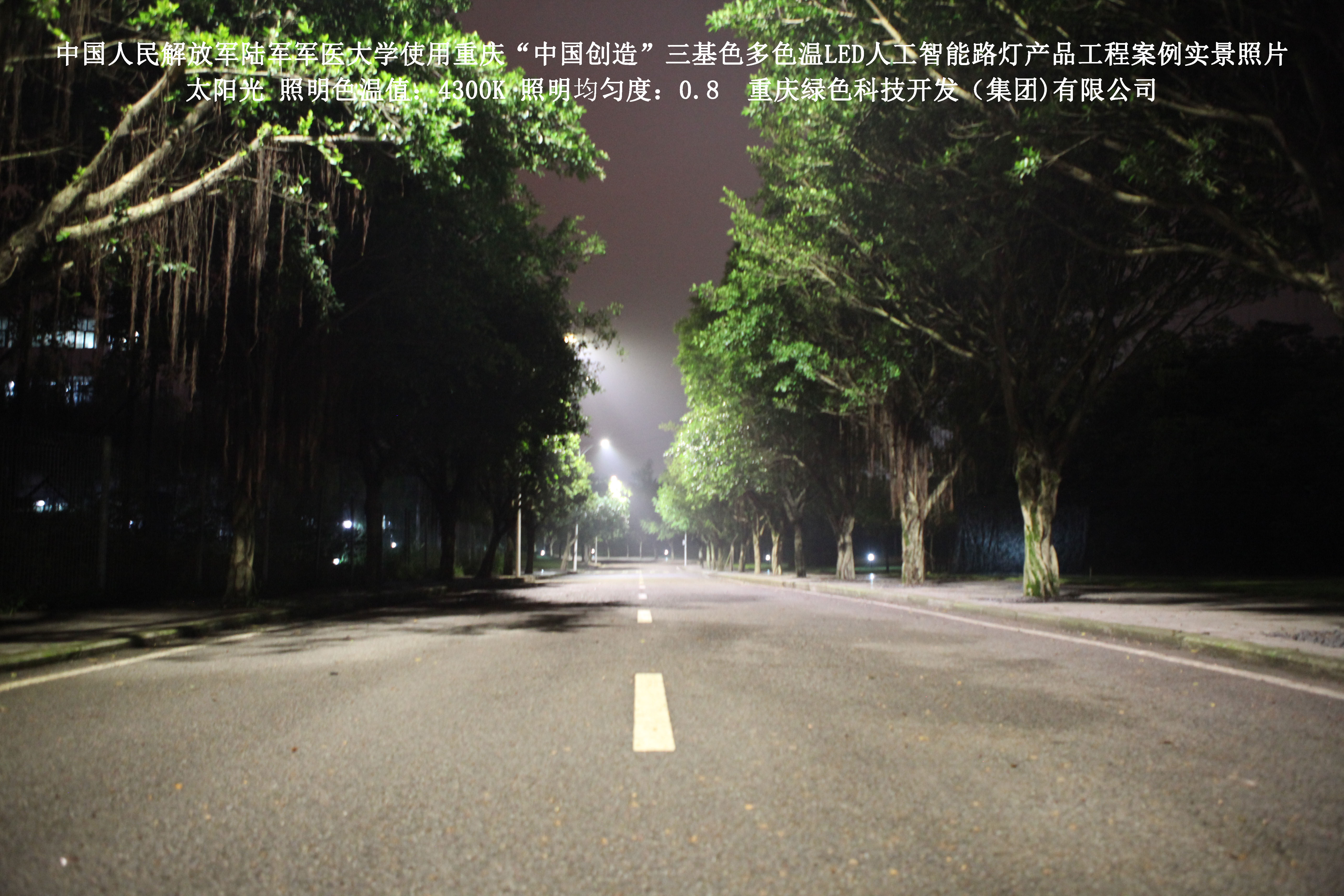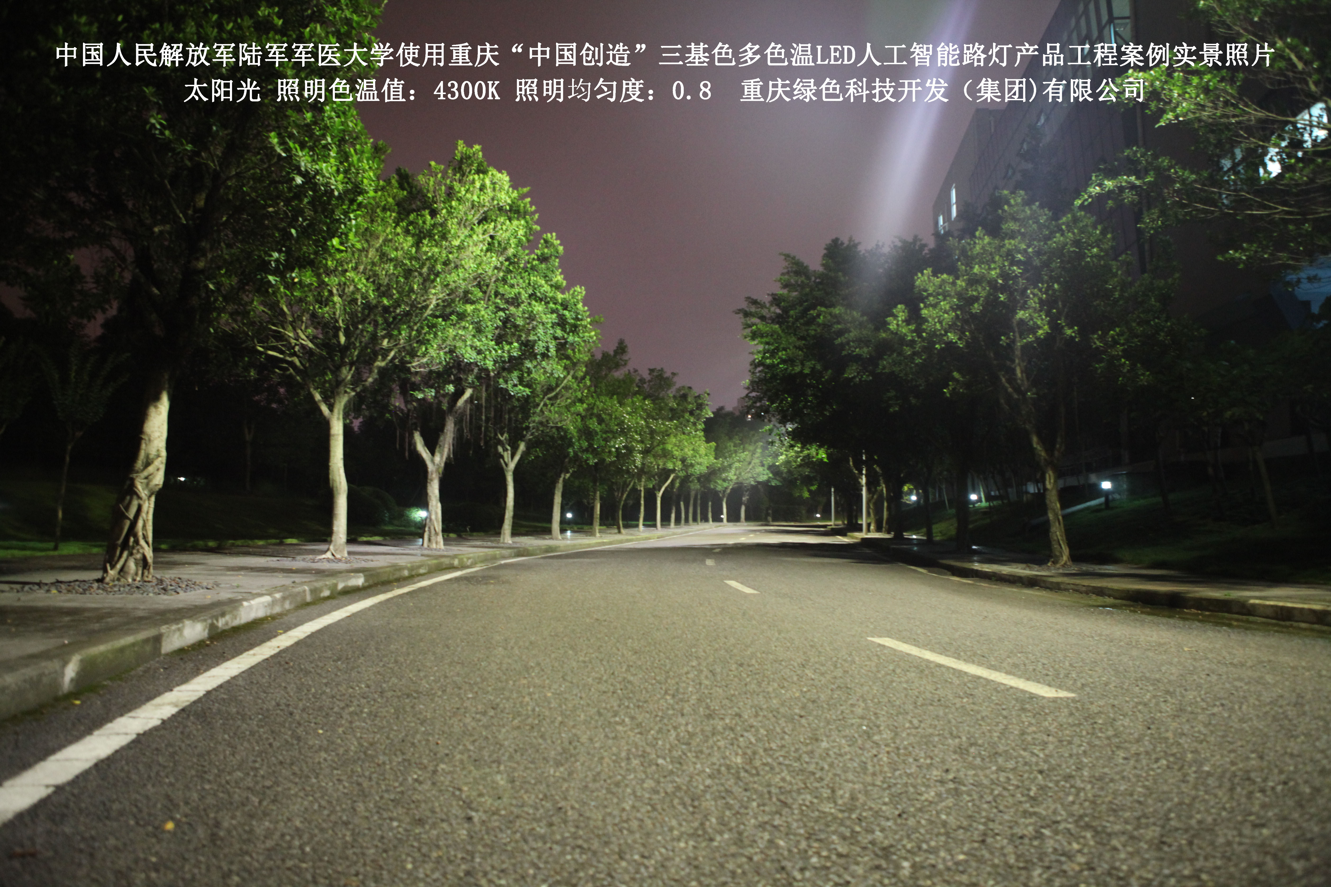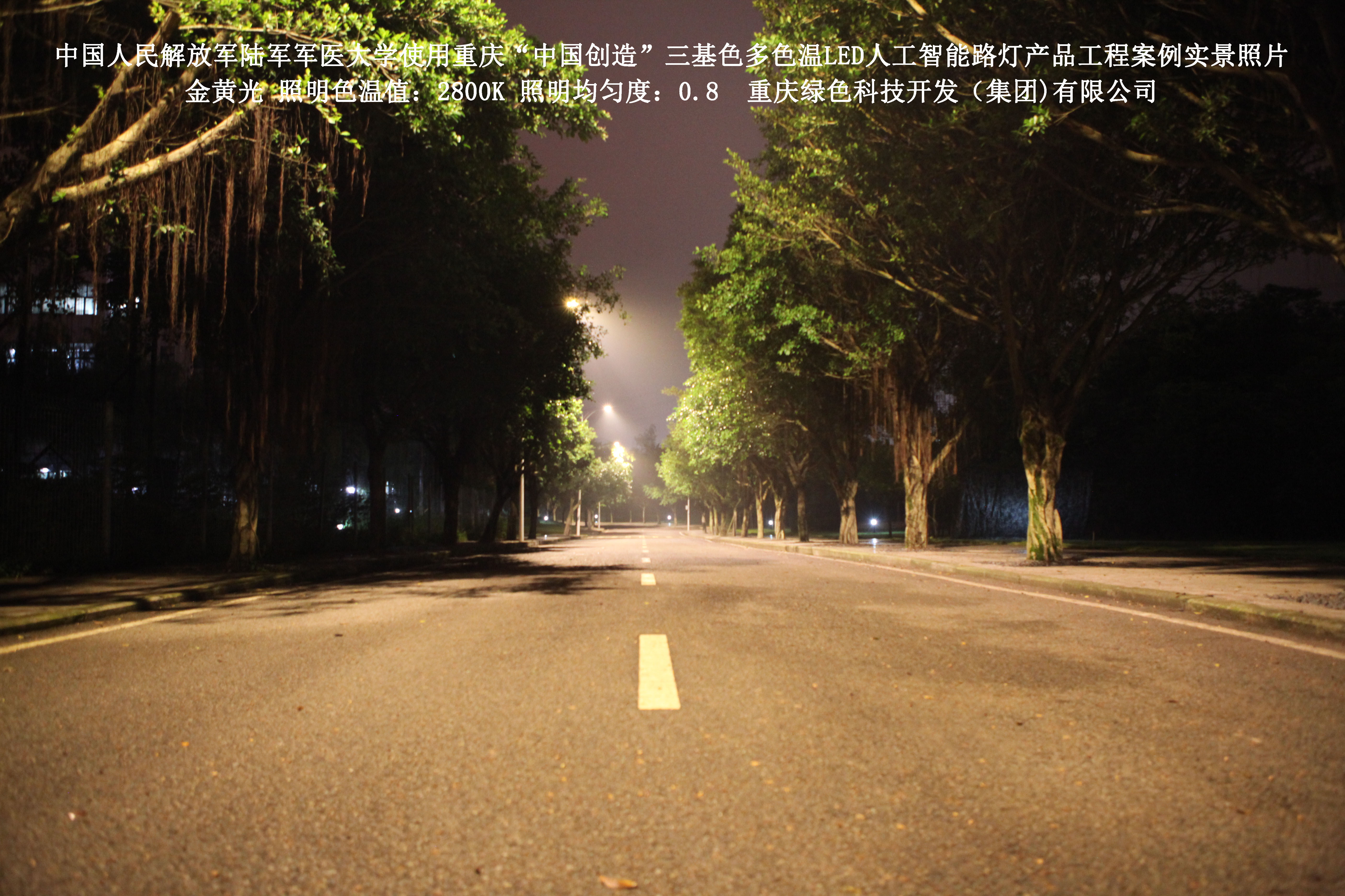 2018年4月,中國(guó)人民解放軍陸軍軍醫(yī)大學(xué)使用了我司研發(fā)制造的重慶“中國(guó)創(chuàng)造”三基色多色溫LED人工智能路燈,對(duì)沙坪壩大學(xué)城校區(qū)道路實(shí)施了綠色照明科技節(jié)能改造工程,該工程已全面竣工。工程實(shí)施后,極大地提高了照明清晰度、燈光均勻度、舒適度,實(shí)現(xiàn)城市路燈照明系統(tǒng)的智能化管理。